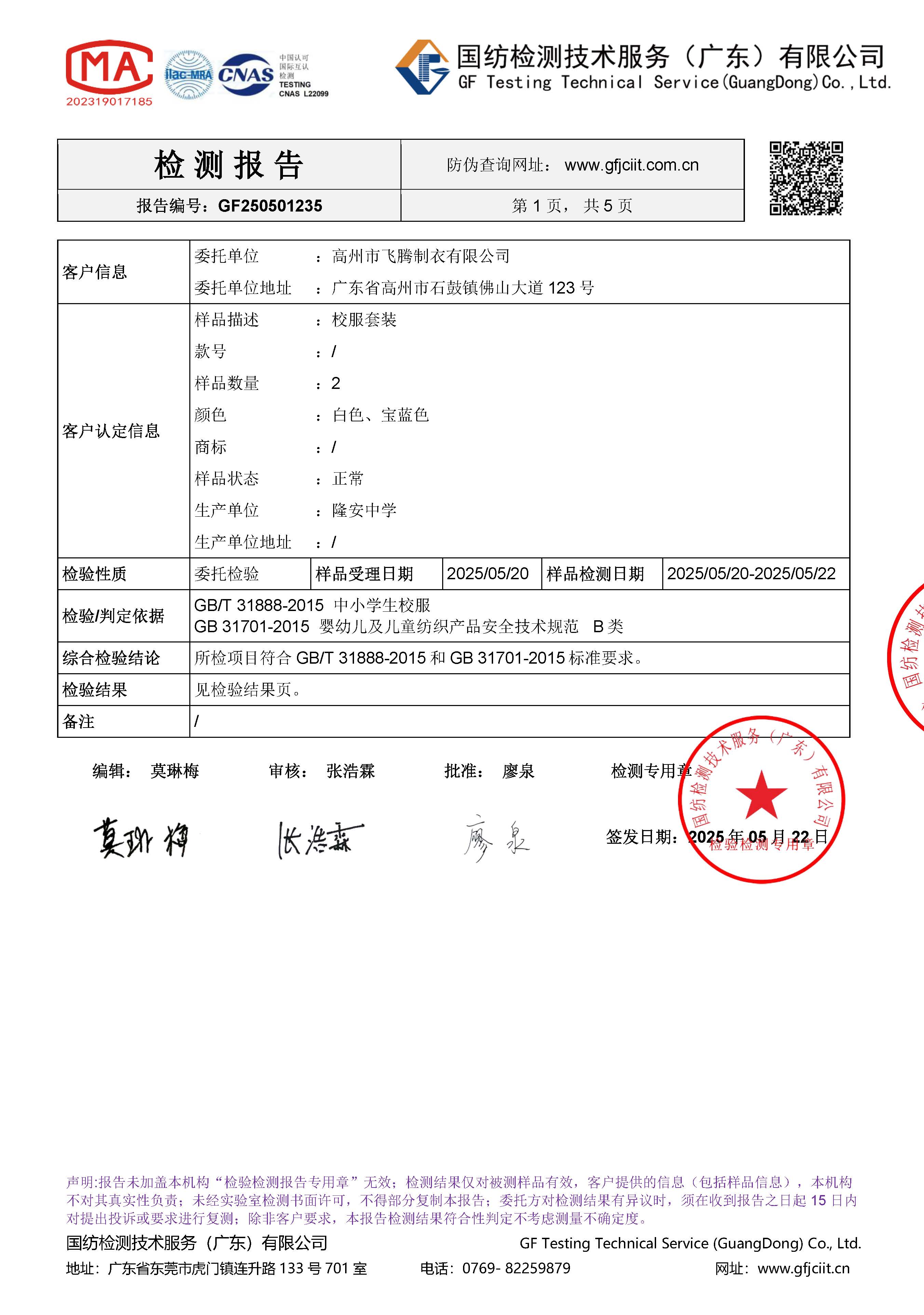 受检服装产品名称:隆安中学-夏装校服