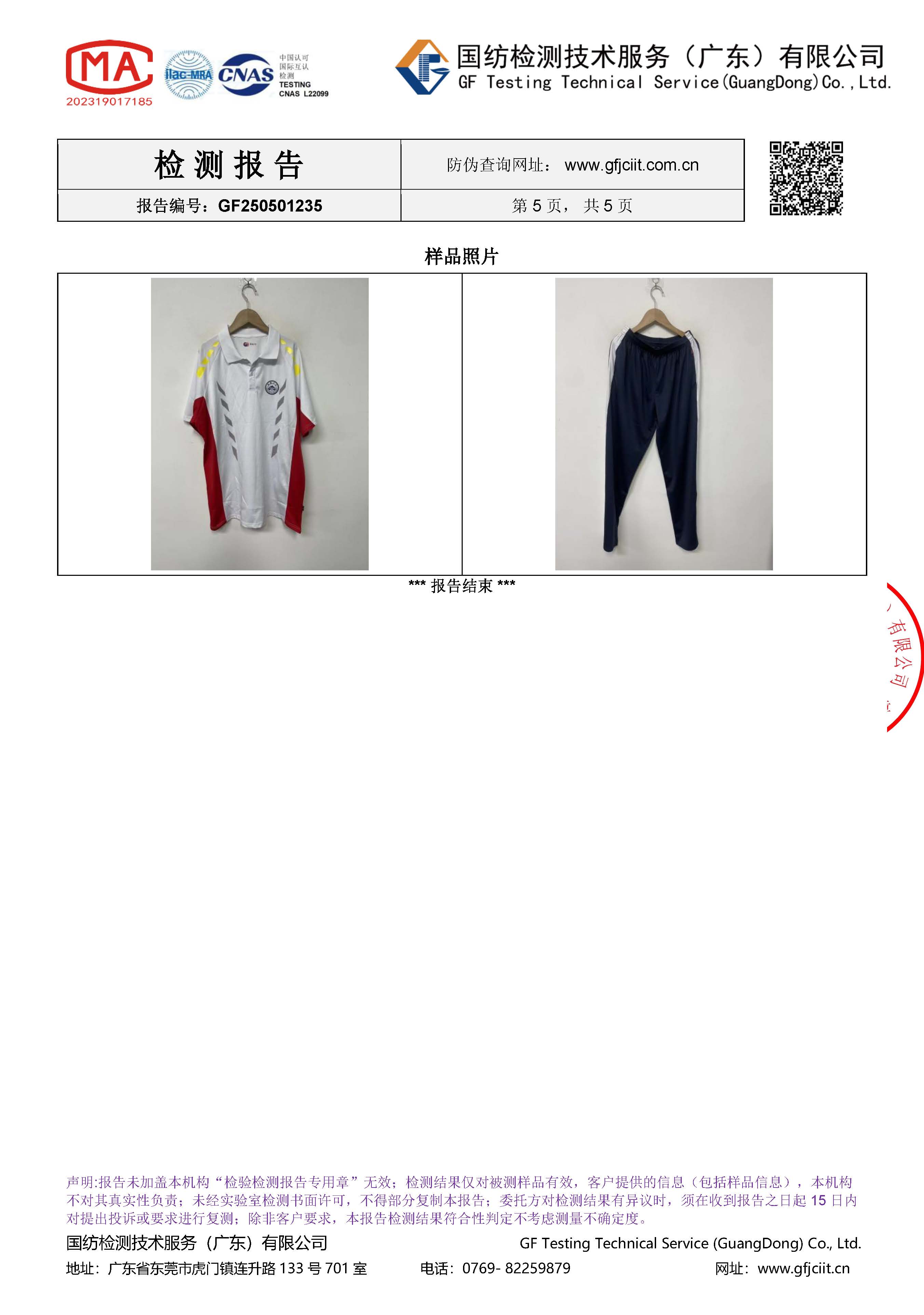 受检测服装各项明细如下: