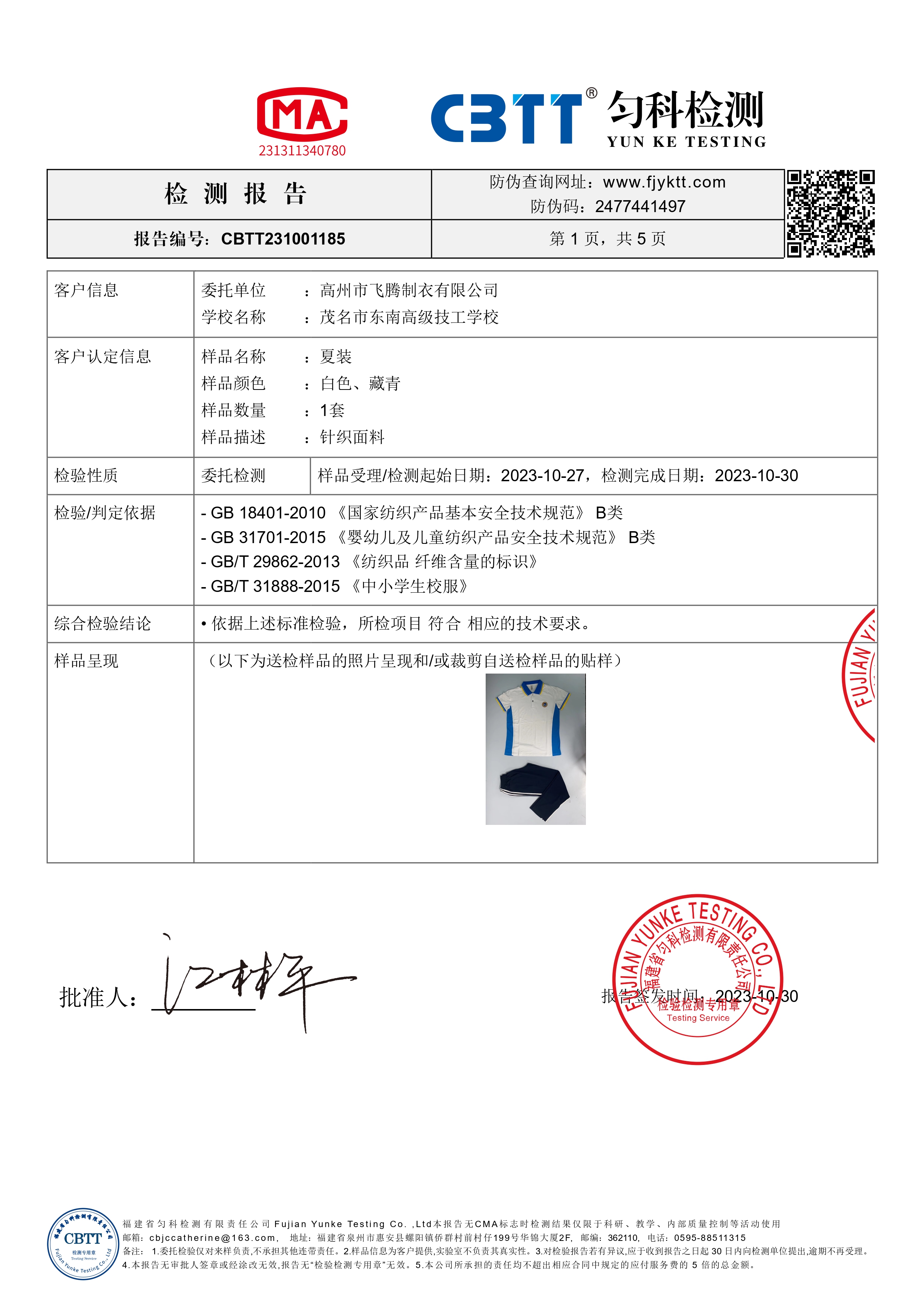 受检服装产品名称:茂名市东南高级技工学校-夏装校服