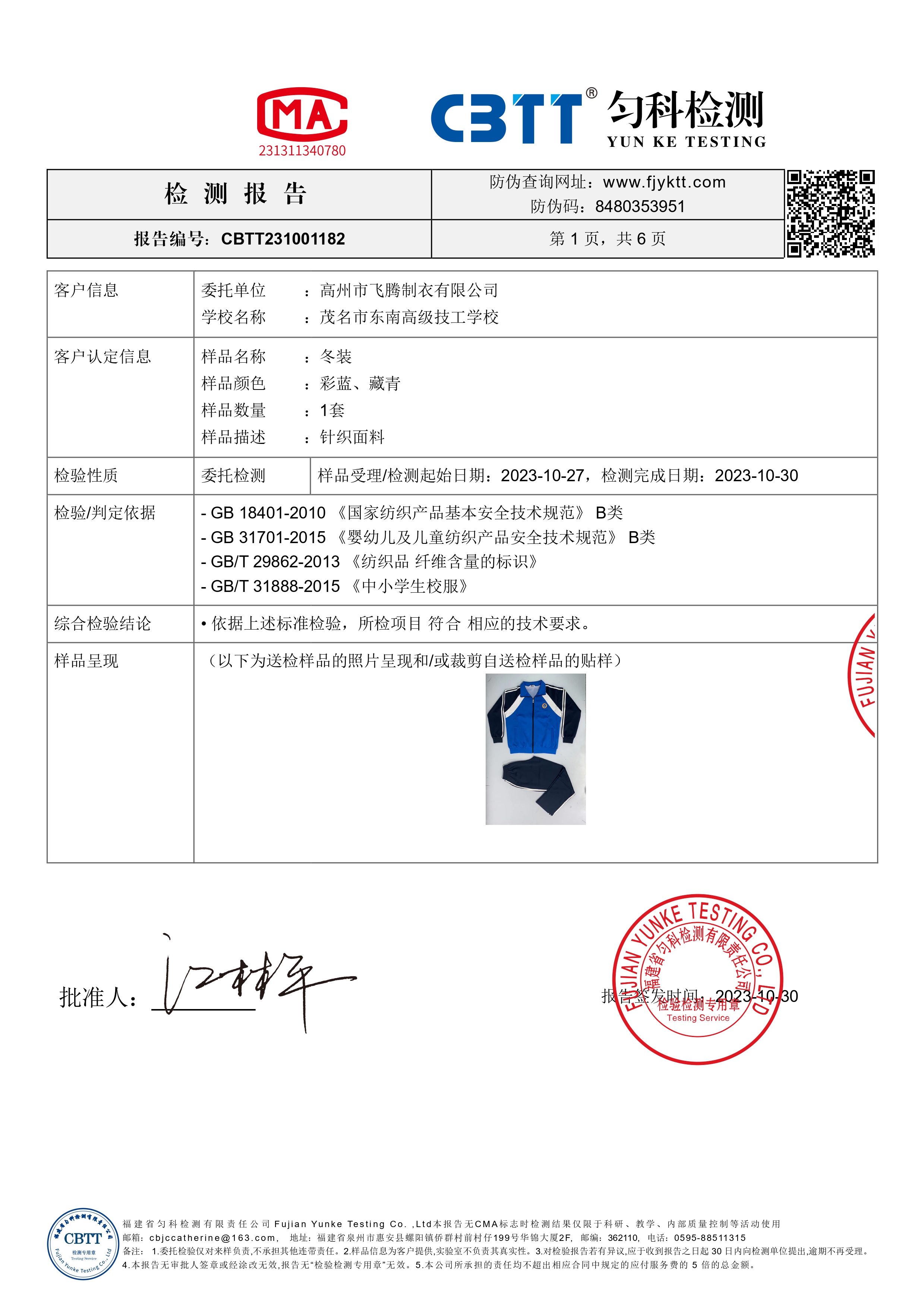 受检服装产品名称:茂名市东南高级技工学校-冬装校服