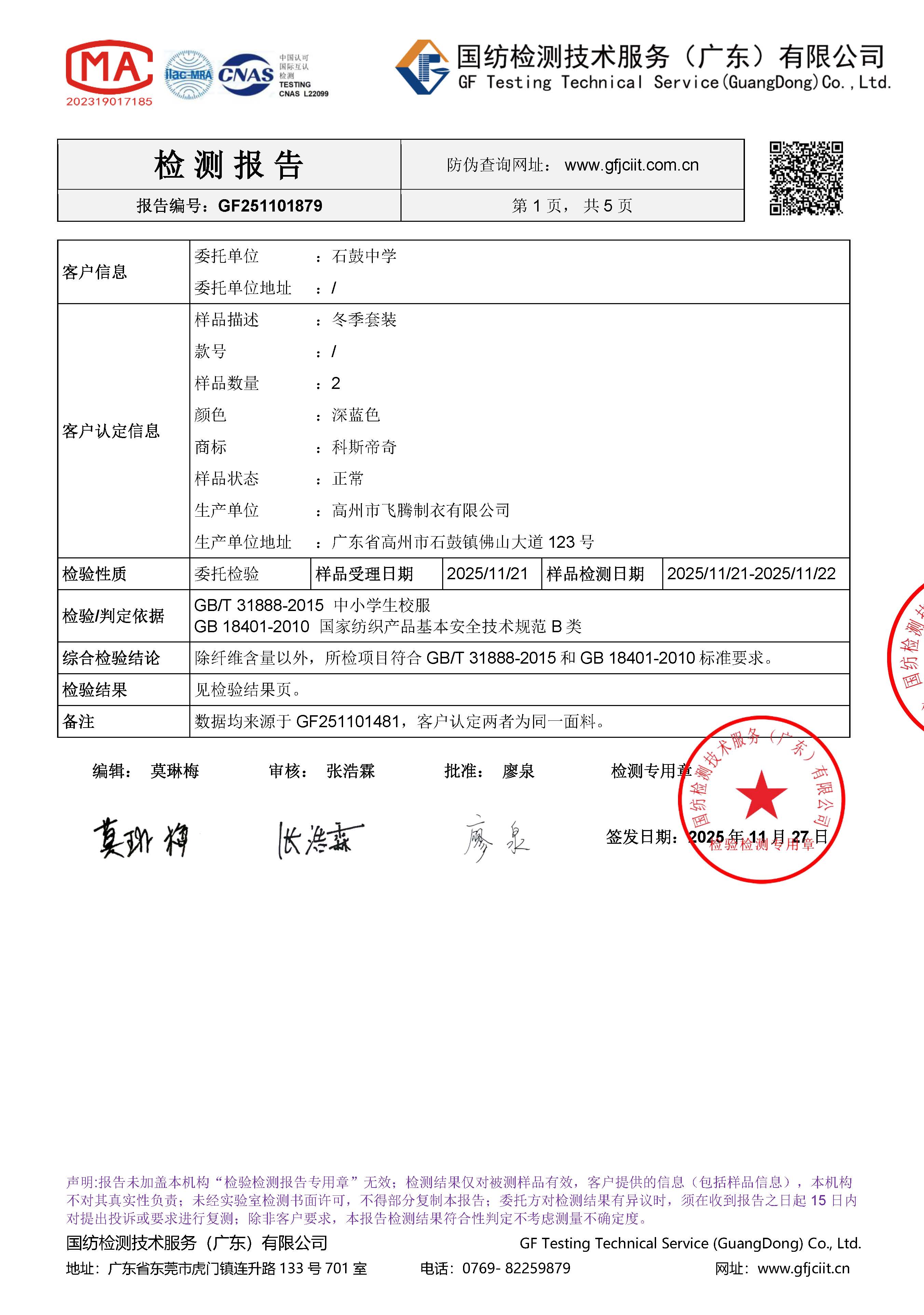 受检服装产品名称:高州市石鼓中学 - 校服套装