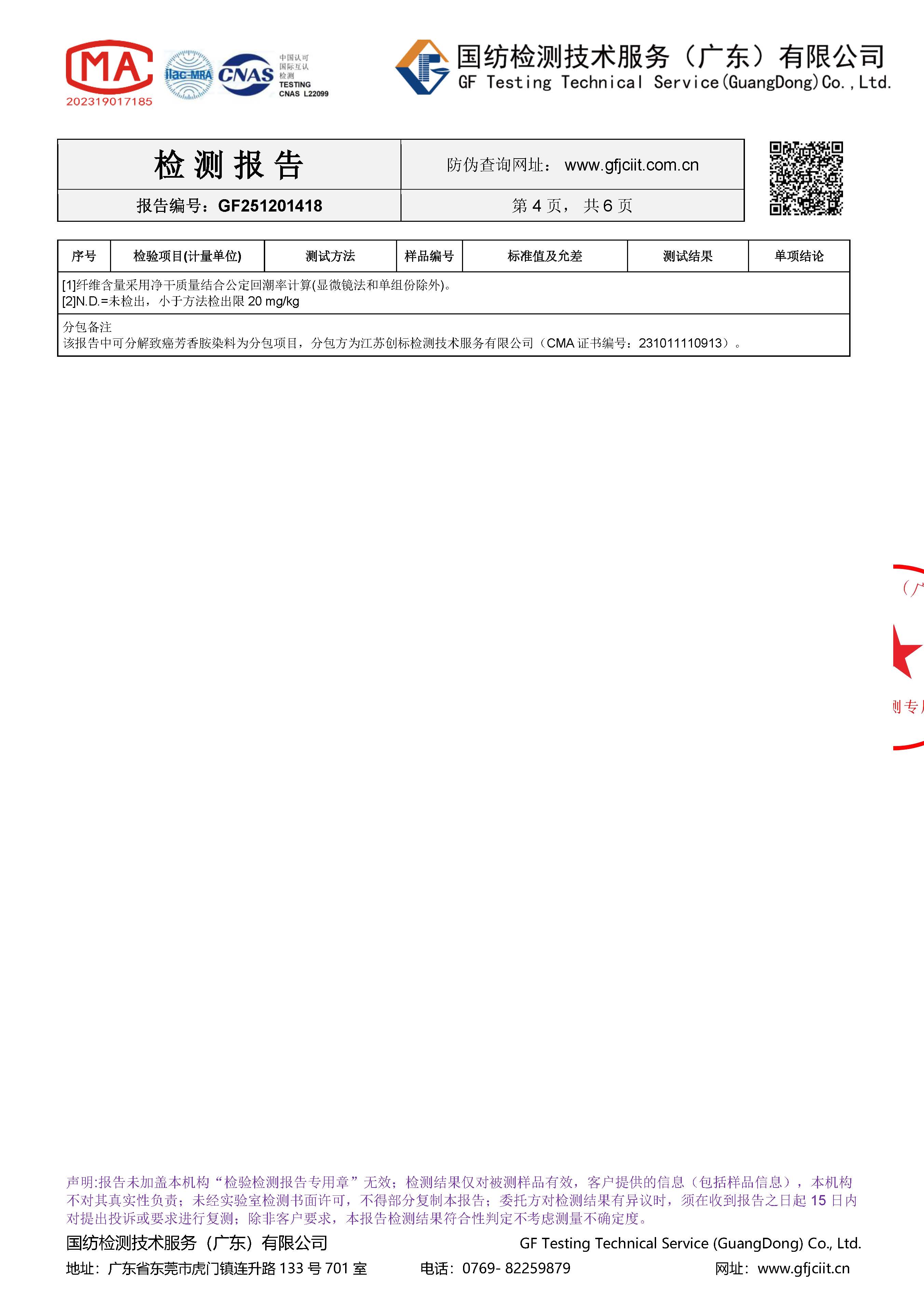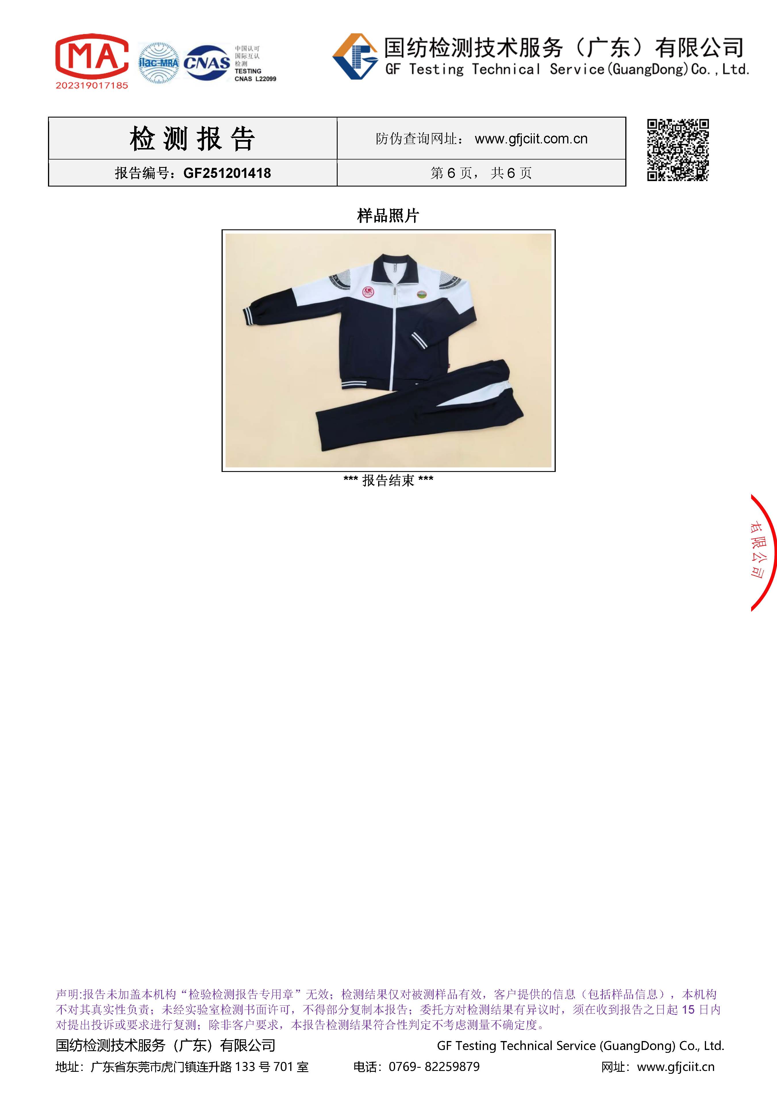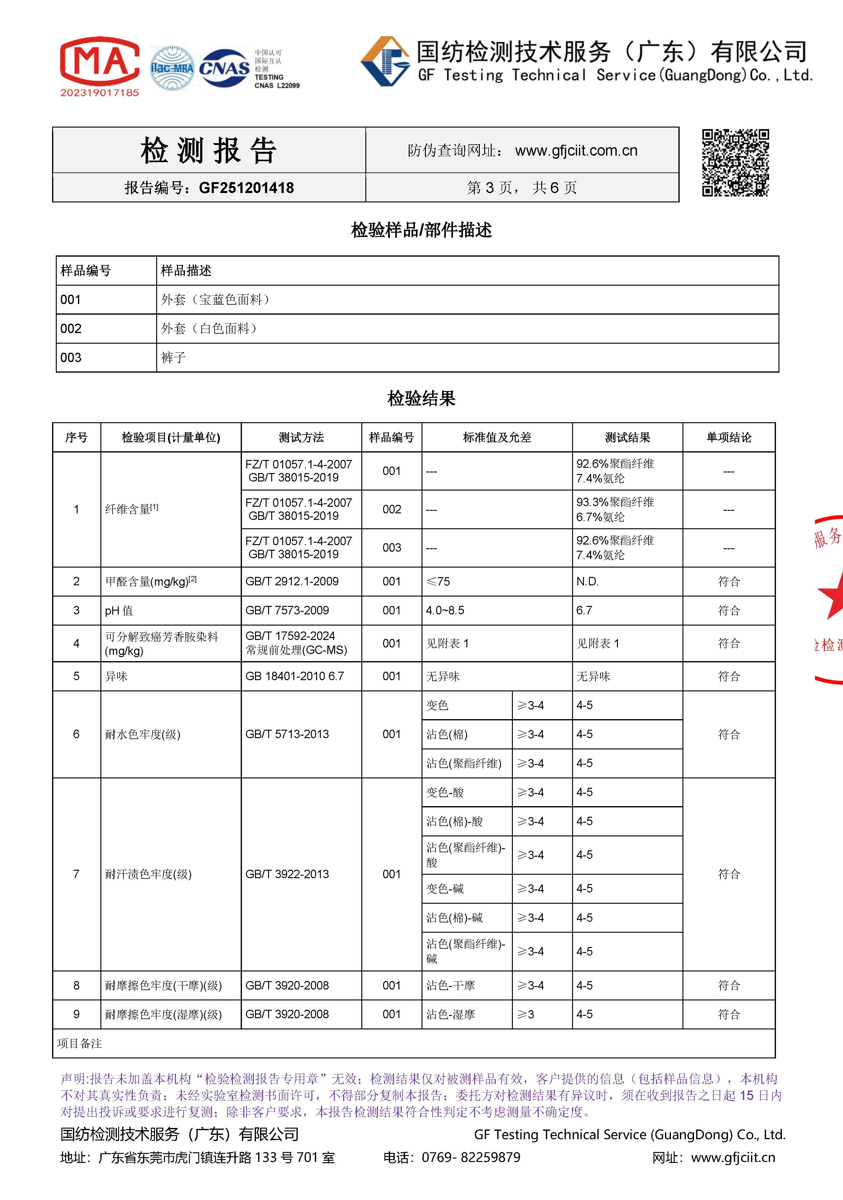 受检测服装各项明细如下