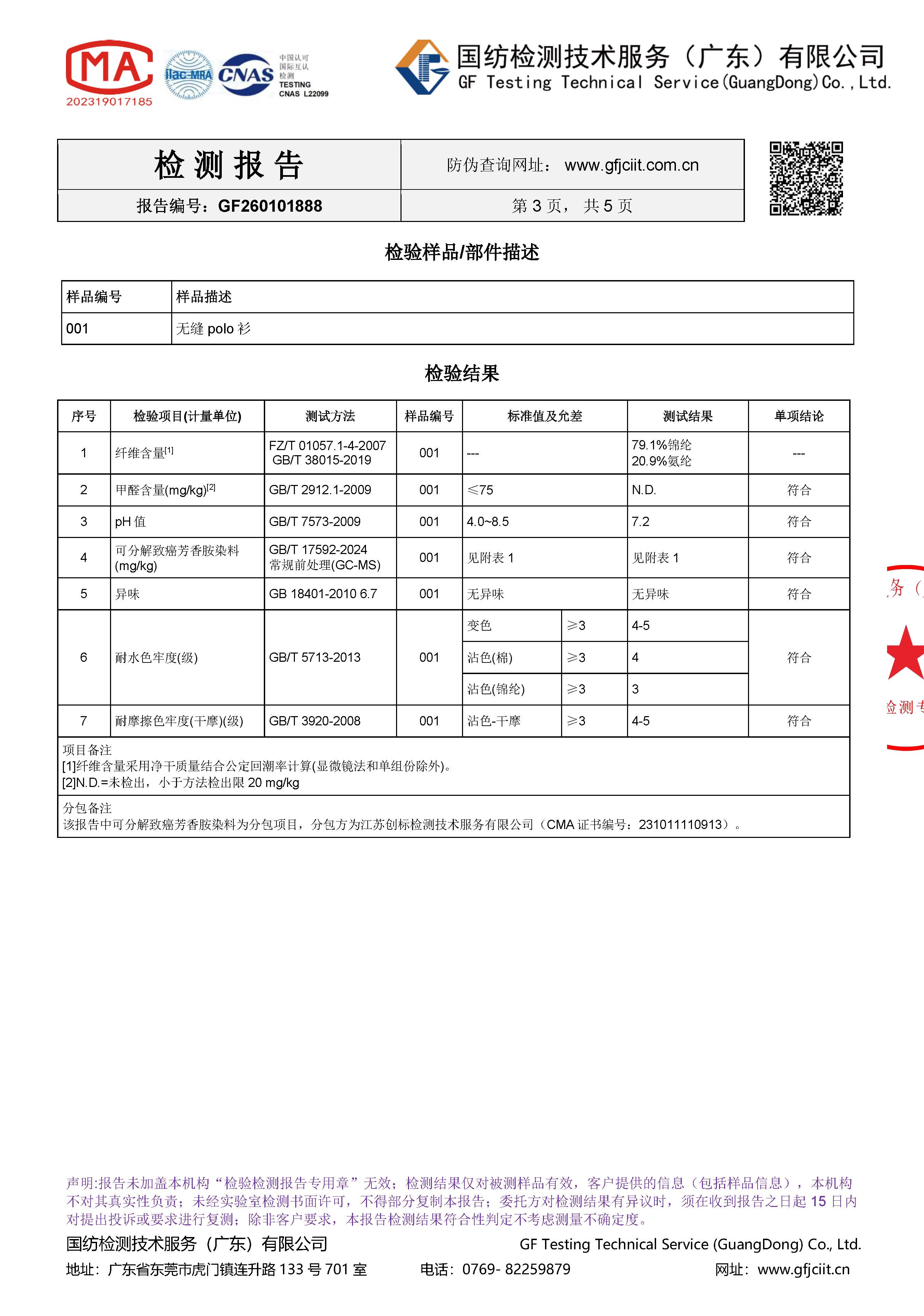受检测服装各项明细如下