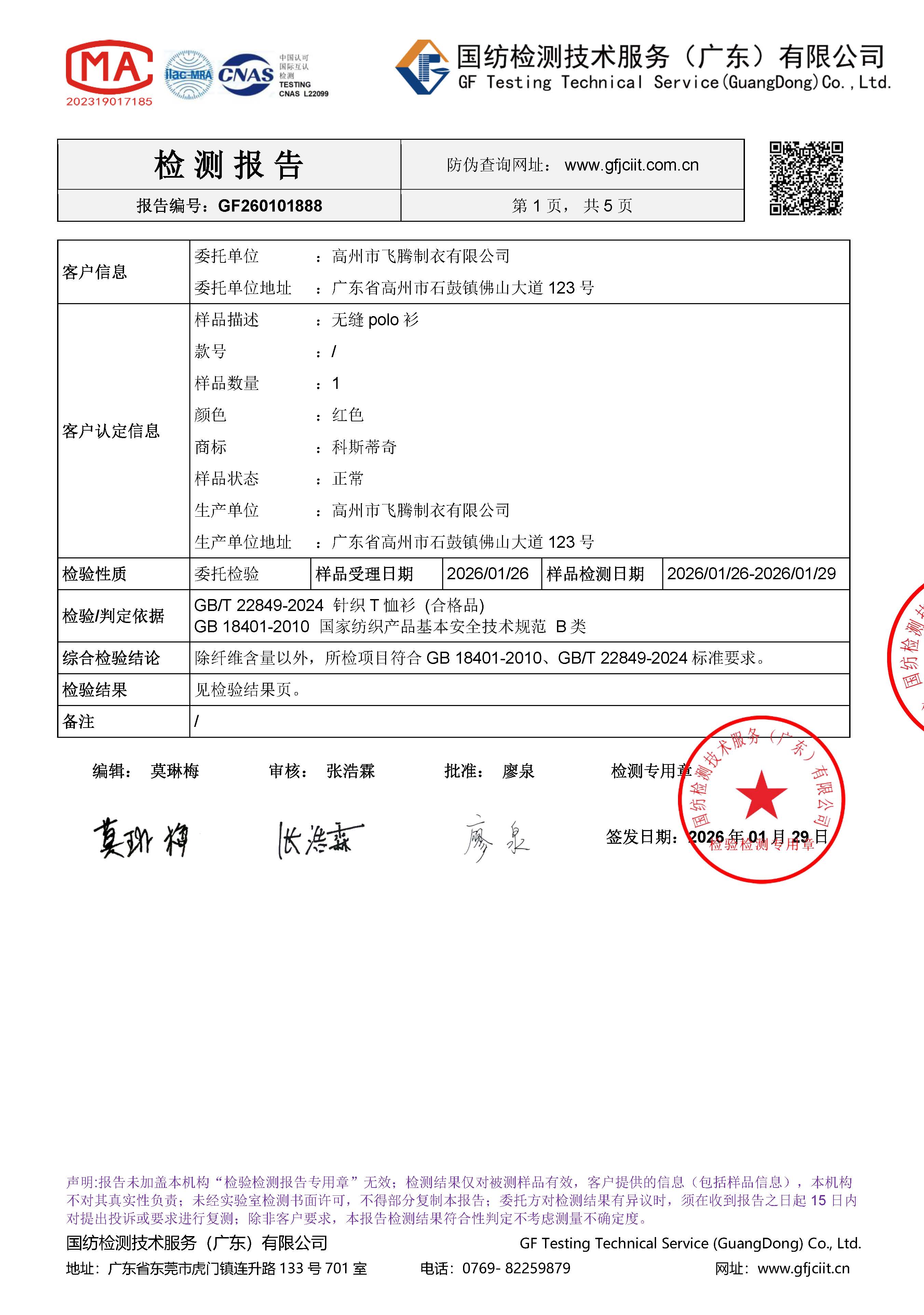 受检服装产品名称: 飞腾情感服饰- polo衫